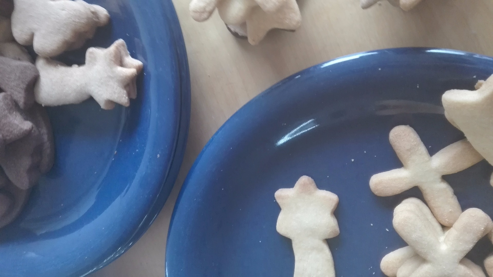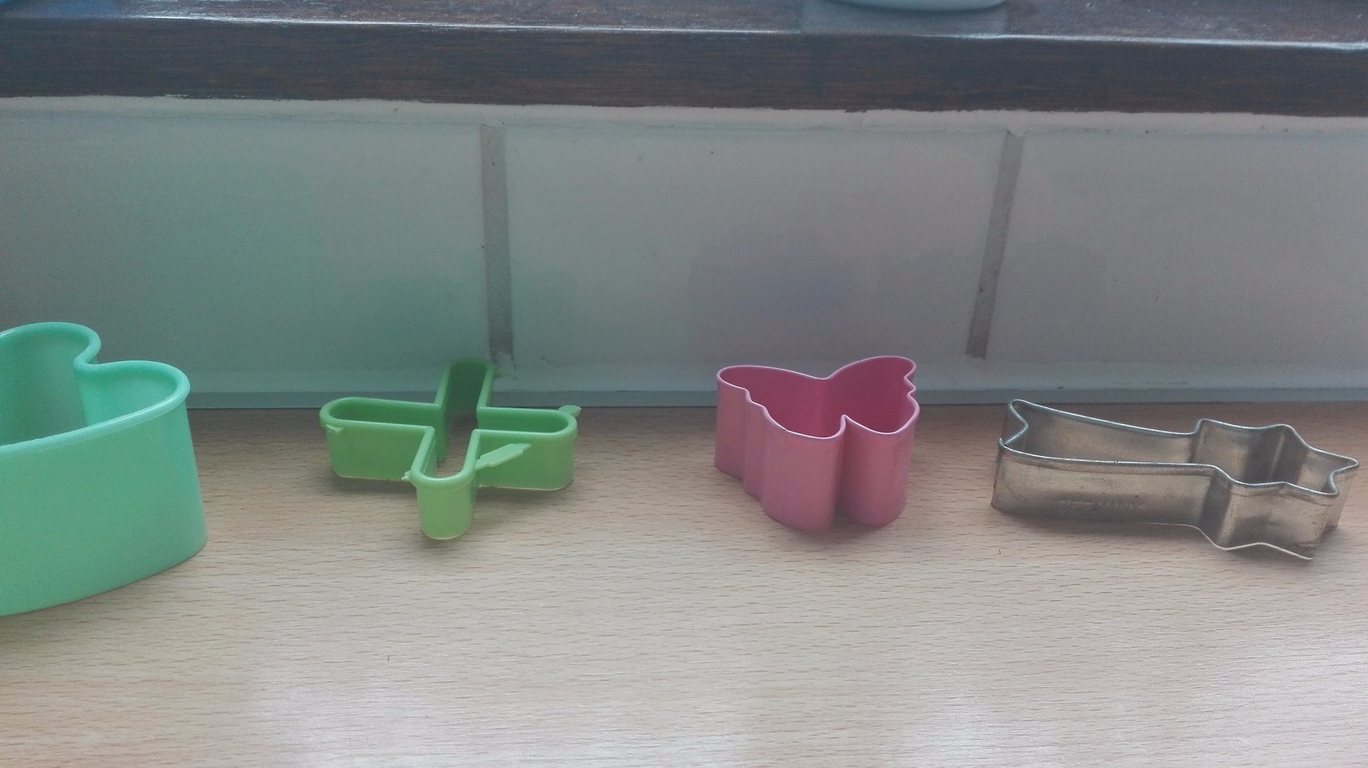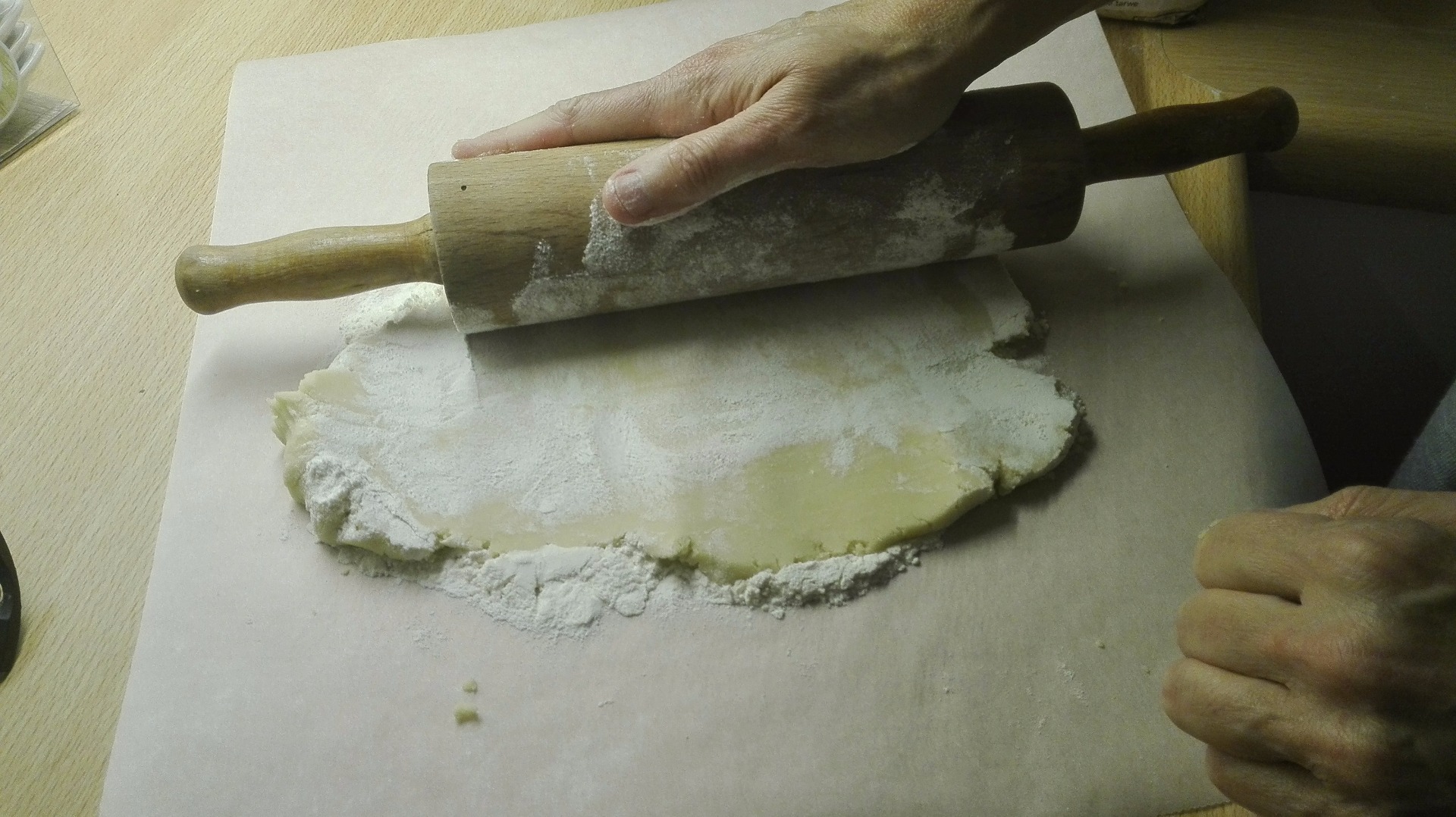 Verwarm de oven voor op 175 °C. Bestuif het werkblad met wat bloem en rol het deeg uit tot een lap van ca. 40 x 40 cm en 3-4 mm dik. Steek met behulp van uitsteekvormpjes of een glas koekjes uit het deeg. Kneed het resterende deeg tot een bal en rol opnieuw uit tot al het deeg gebruikt is. Leg de koekjes op enige afstand van elkaar op een met bakpapier beklede bakplaat.